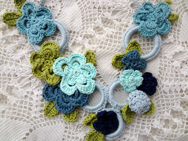 A very important thing to have in mind is that if your crochet piece has any metal parts, you should immediately dry those parts and even use the hairdryer to dry it faster because it might ruin your jewelry. The necklace shown above has no metal parts. The rings are plastic but they pose no danger. Also if you have any wooden parts, above tip should be followed (as for the metal parts).